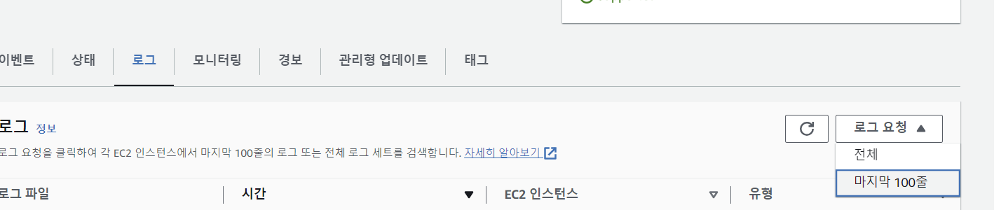 환경에서 로그 메뉴를 눌러서 현재 서버의 로그를 받아 볼 수 있다.