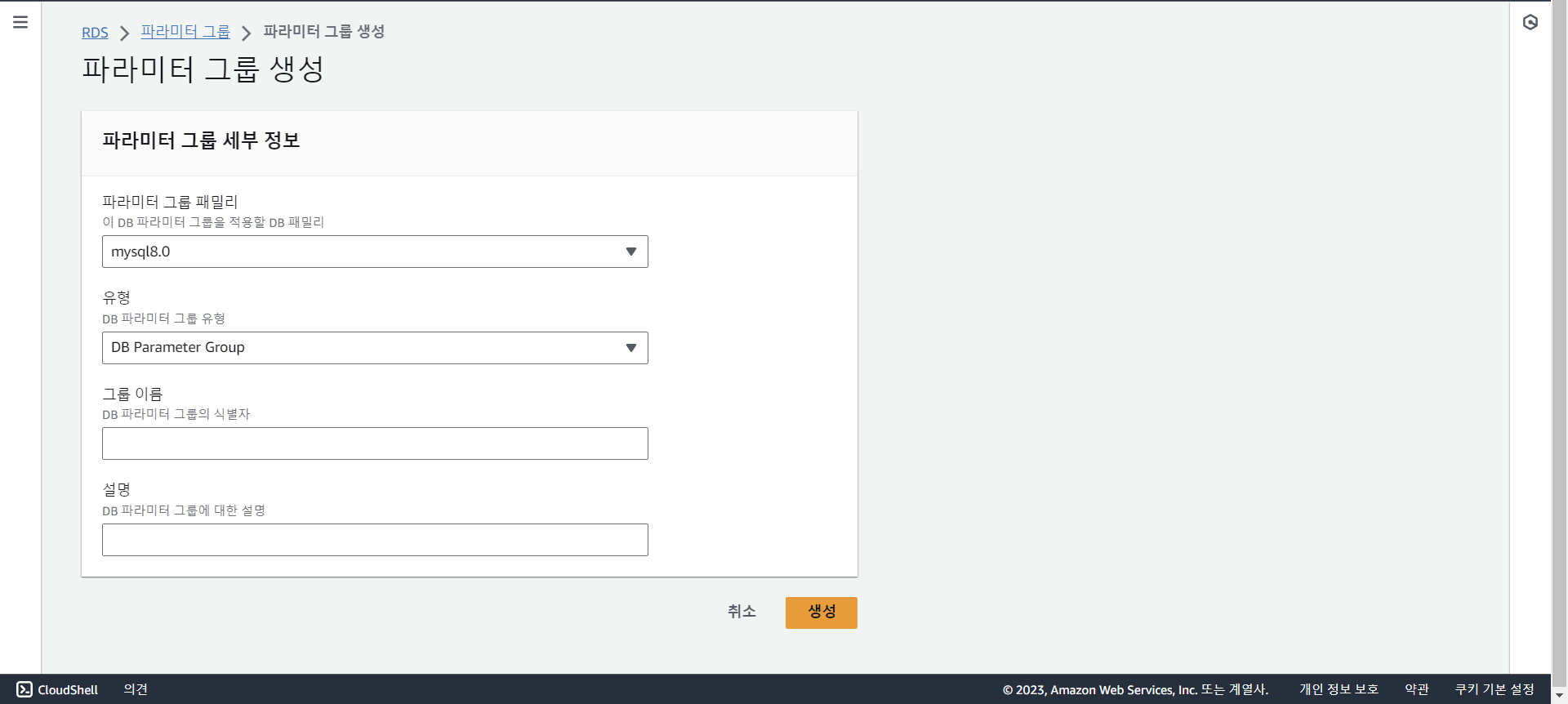AWS의 RDS에서 파라미터 그룹을 추가해줍니다.