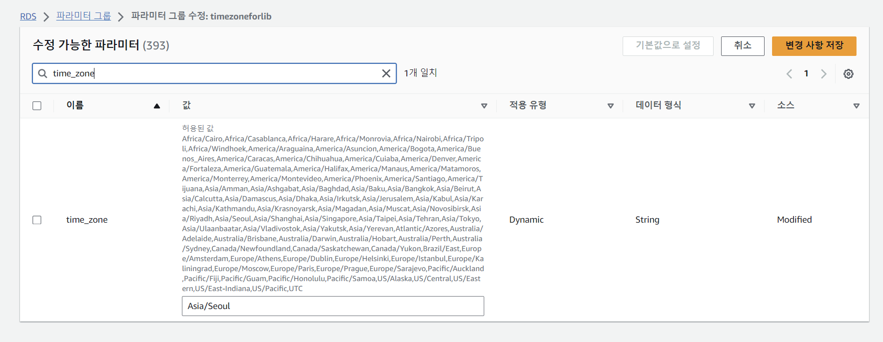 time_zone을 검색하고 'Asia/Seoul'를 입력하고 [변경 사항 저장]을 눌러주세요.