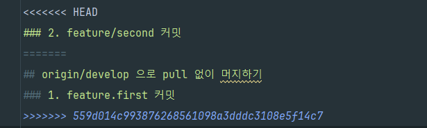 머지 충돌이 발생한 파일을 열어보면 어디가 문제가 되는지 확인할 수 있습니다.