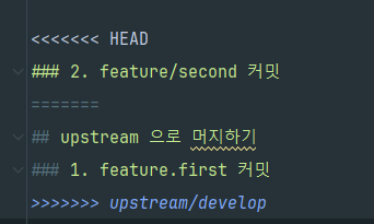 하지만 upstream을 사용해서 최신 develop 기준으로 feature 브랜치를 업데이트를 하면 머지 충돌을 미리 해결할 수 있습니다.